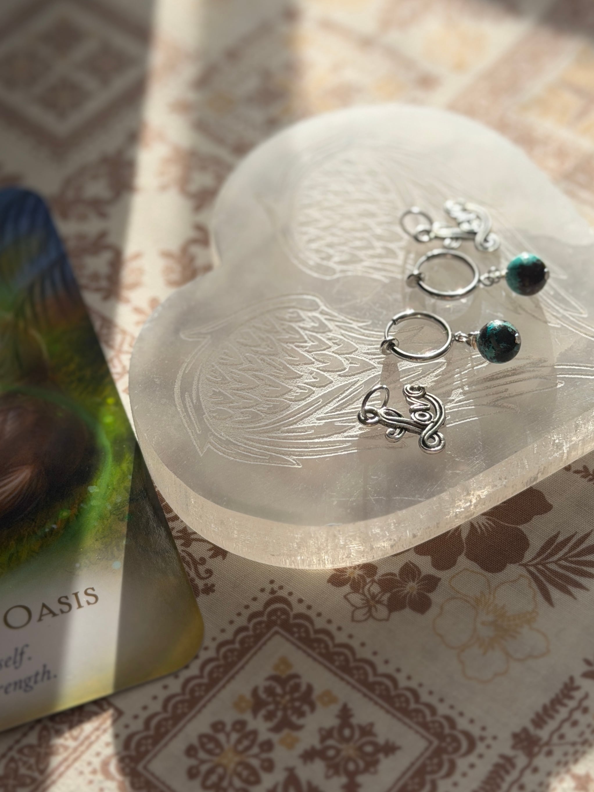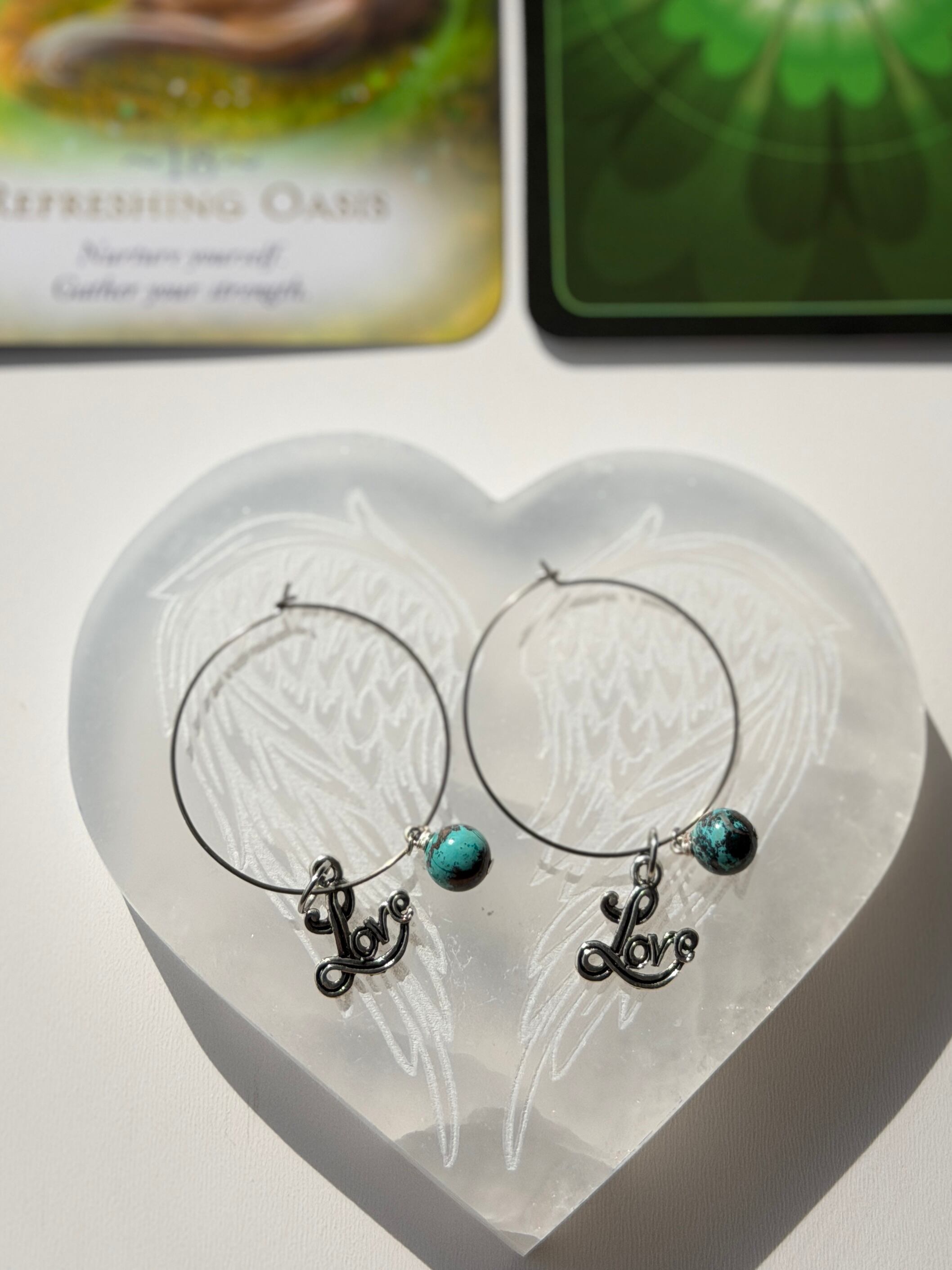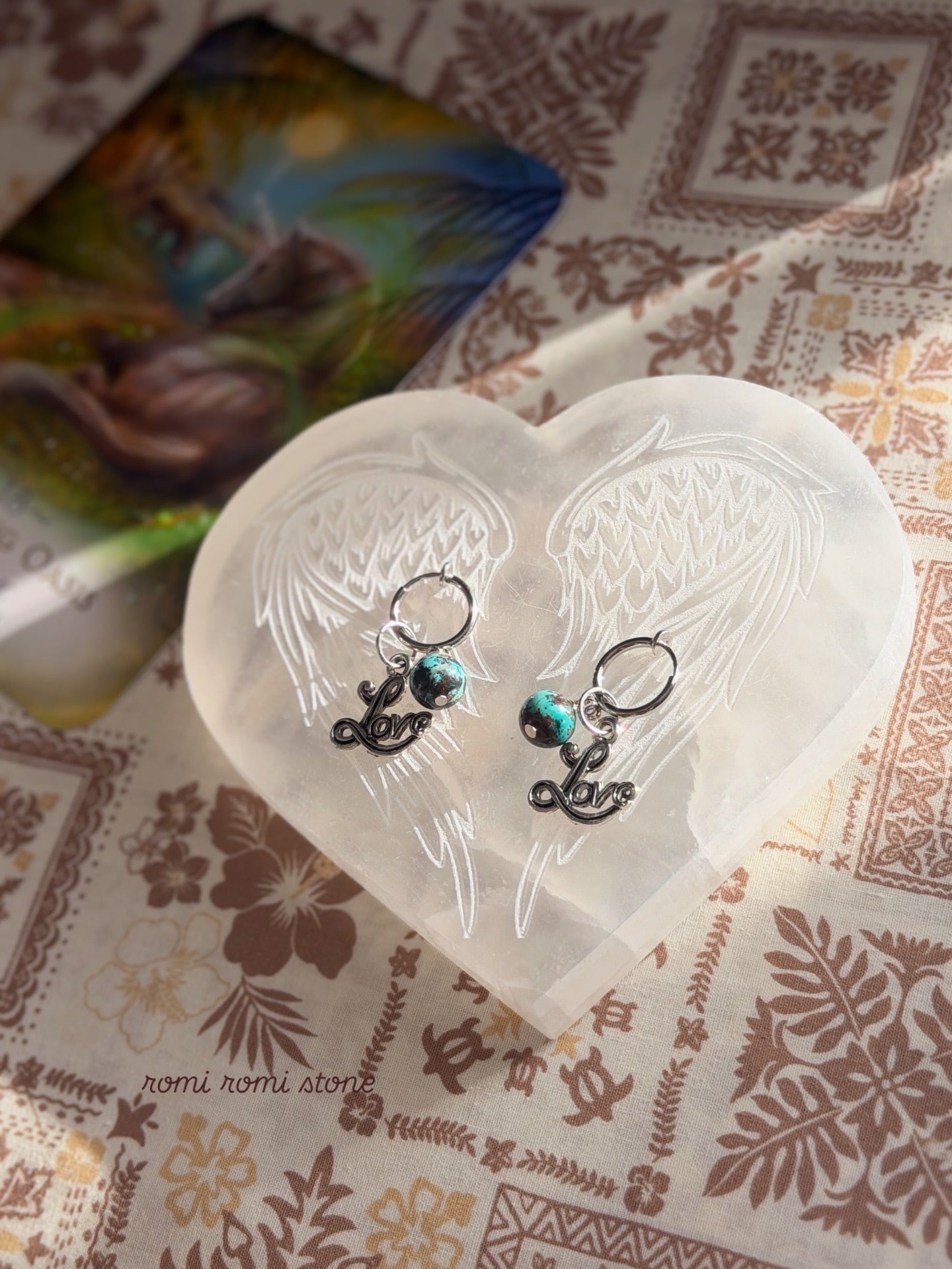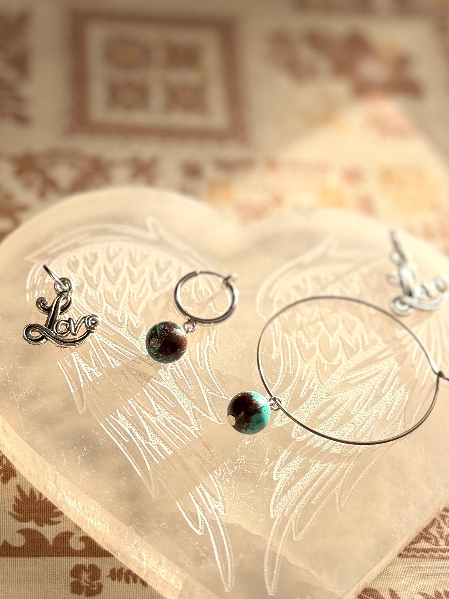 御守石クリソコラがLoveピューター(錫)チャームと優しく揺れながら寄り添います。