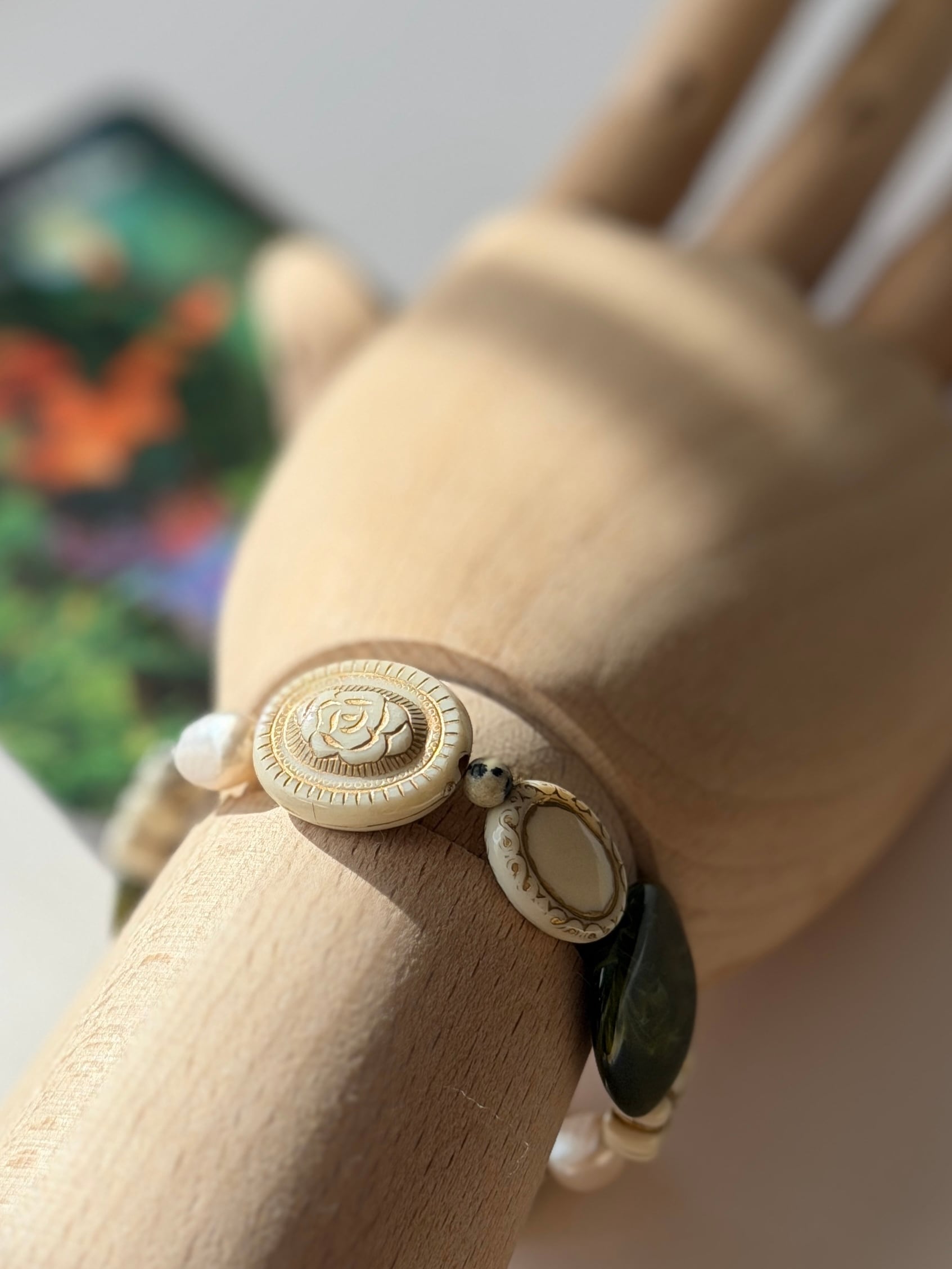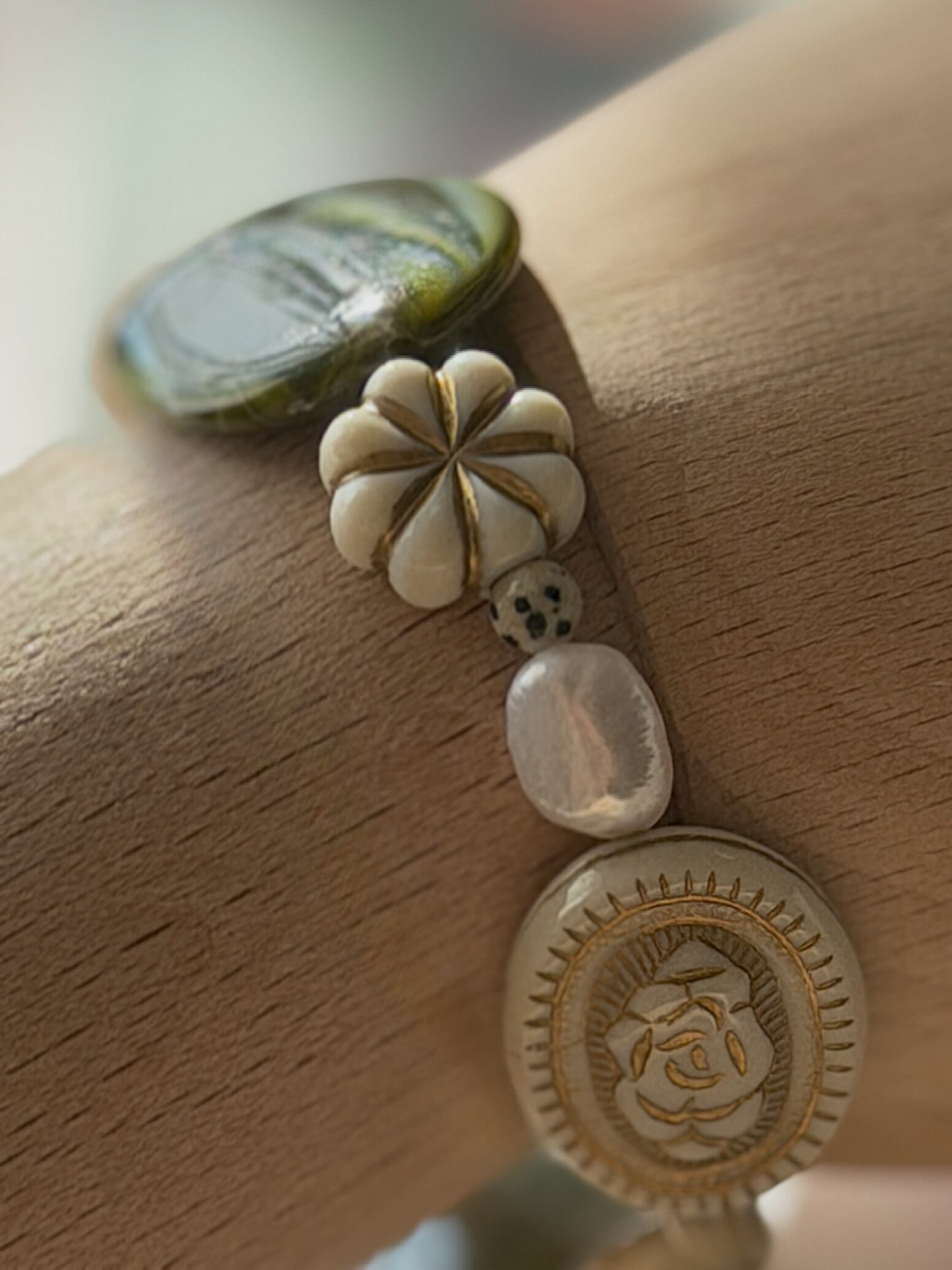 【ダルメシアンジャスパーとアンティーク風ビーズの軽やかブレスレット】