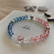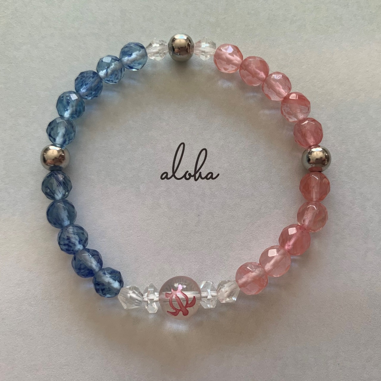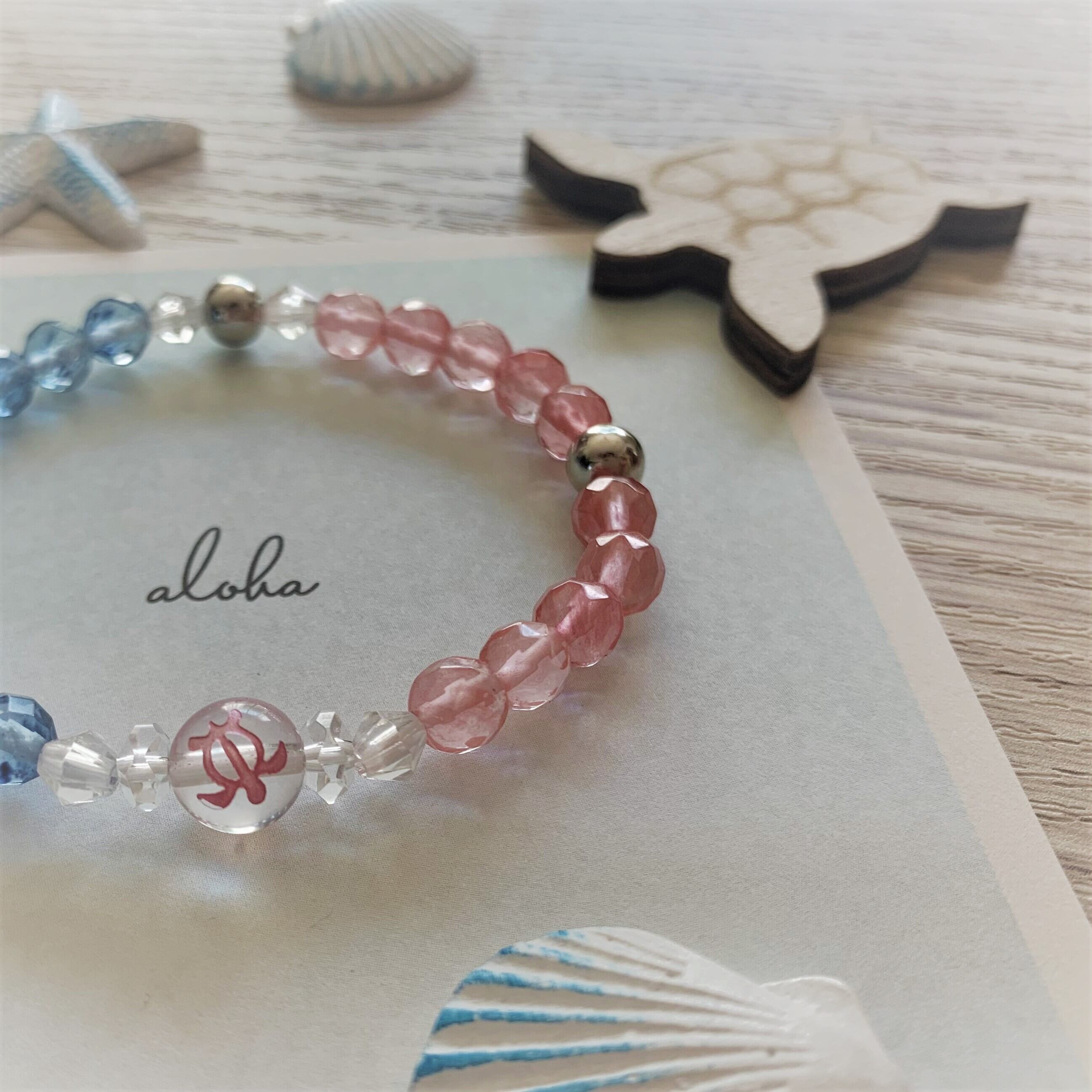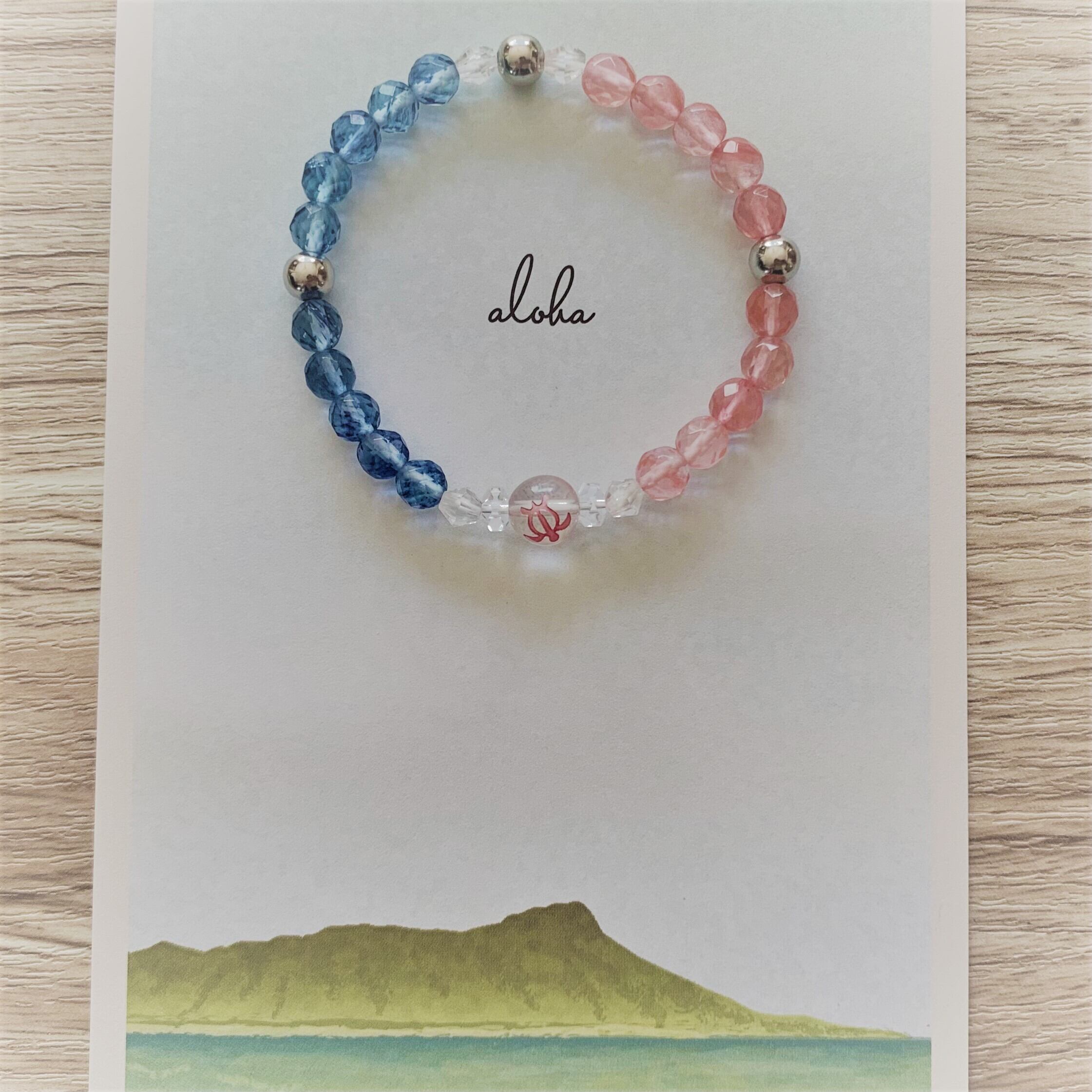 ハワイで幸運の象徴とされている海亀ホヌが彫刻された水晶を組んだマリンカラーのブレスレットです。